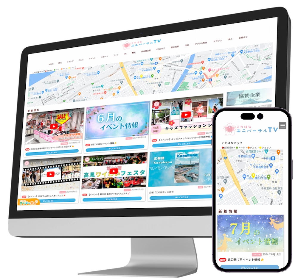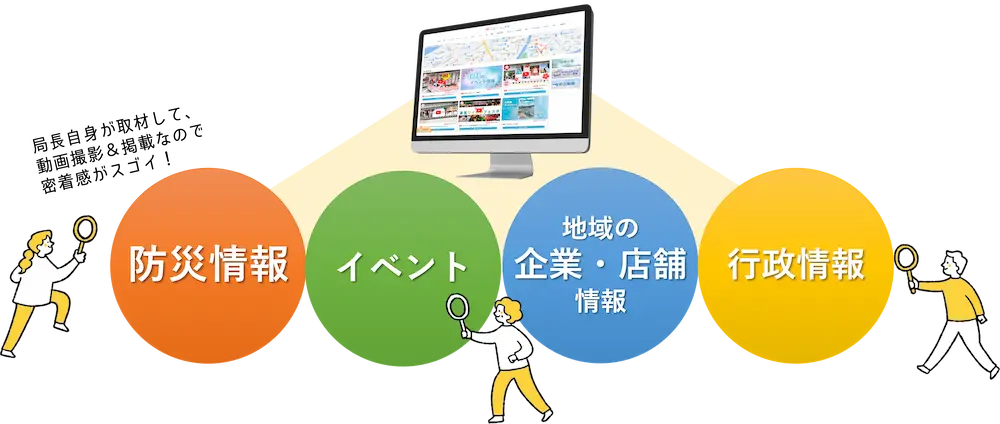 まちテレ動画では、局長がイベント情報やニュース・店舗情報など、地域の皆様にニーズのある情報を探し、取材し、動画として掲載します。行政や地元議員などのインタビューや、地域の防災情報など地域に根差した情報を発信しています。